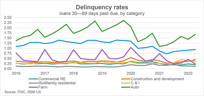 Escalating interest rates and related price differentials that show up in the net interest margin won’t be the biggest challenge for financial institutions. Rather, organizations will need to manage the health of their loan portfolios. These portfolios and their underlying credits have remained very strong in the past few years. The industry has successfully weathered the pandemic and worked through a stretch of multiple quarters with surprisingly low provision expenses, and some institutions even had negative provisions. While this may have resulted in a nice boost to earnings for some institutions, with a potential recession looming, staying in close contact with borrowers and monitoring the health of credits will be of utmost importance as early-stage delinquencies in certain loan categories begin to increase.