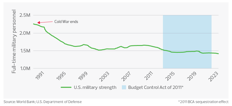 It's anticipated that inflation and caps in defense funding will decrease DoD purchasing power in the coming years, leading to a cut in personnel. As shown in the graph, our U.S. military strength has declined slightly since the Cold War ended. In December, the Congressional Budget Office provided three alternatives to reduce the DoD’s annual budget. All three reduction alternatives would be achieved by decreasing the number of full-time military personnel between 18% and 21%, primarily affecting the U.S. Army and Air Force.