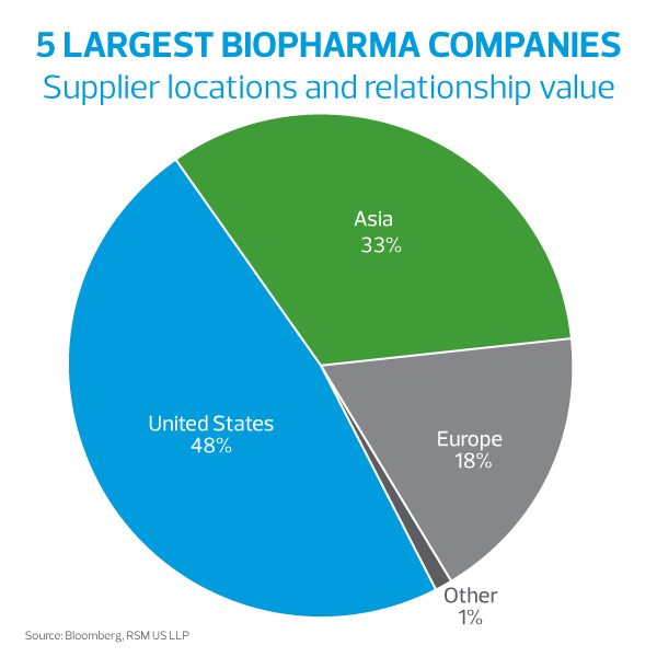 With all this global complexity, there are numerous implications related to the U.S. administration’s approach to trade and tariff policy. For the five largest biopharma companies, over one-third of their supply spend comes from Asia, according to Bloomberg, with 32% of active pharmaceutical ingredients (APIs) being produced in China, according to data from the U.S. Food and Drug Administration.