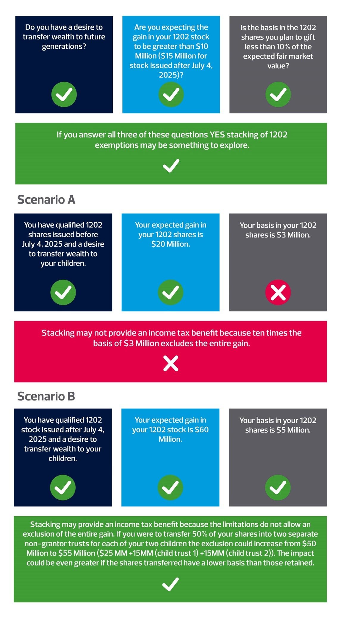 Nongrantor trusts are a powerful tool for expanding the section 1202 QSBS exclusion. However, success depends on careful attention to technical requirements, preserving QSBS status throughout all transfers and ensuring that the planning fits with your overall goals. To help determine if this strategy is right for you, consider the following framework: