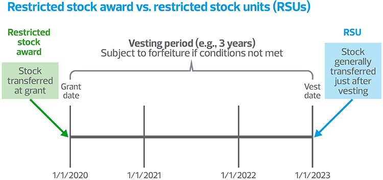 - A restricted stock award transfers shares to the recipient at grant, but the shares are subject to forfeiture until the vesting conditions are satisfied. With RSUs, shares are not transferred until the RSU vests (see diagram below).