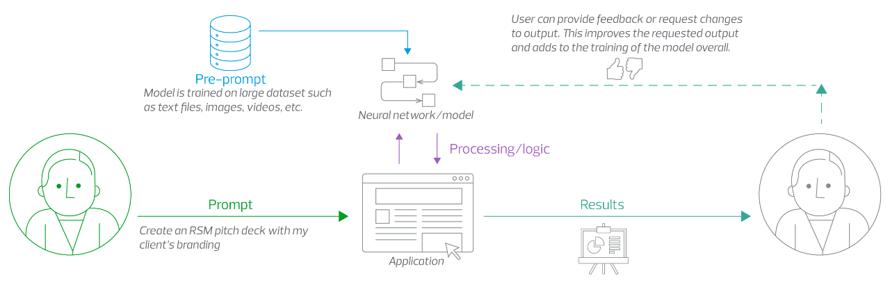 Walking through how generative AI tools operate, a company has a model that is trained on large data sets. A user will prompt the application with a task or question that is run through the neural network or model. The application provides results, and the user can provide positive or negative feedback, which trains the model to be even more effective.