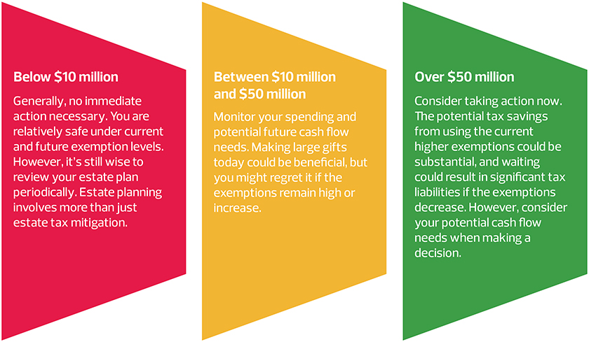 Given the ever-present long-term uncertainty surrounding the estate/gift and GST exemptions, it’s crucial to consider your options based on your current net worth and future financial plans. Here’s a general guide based on your net worth (per individual):