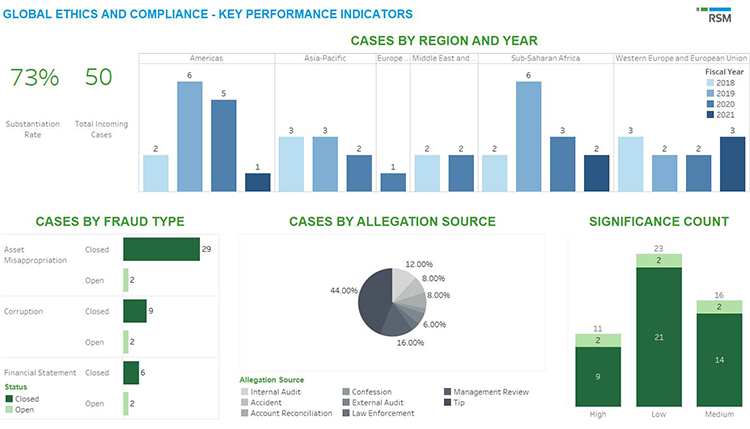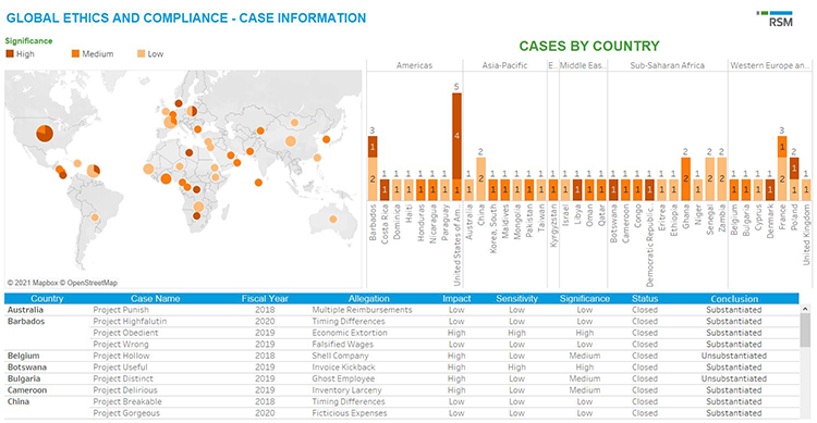 For example, RSM was recently engaged by a consumer products firm to design a centralized case management system for its global ethics and compliance program. Using historical data and real-time data captured in the case management system, RSM professionals created customized, interactive dashboards that highlight key indicators, including timing of intake and data on planning, fieldwork and reporting.