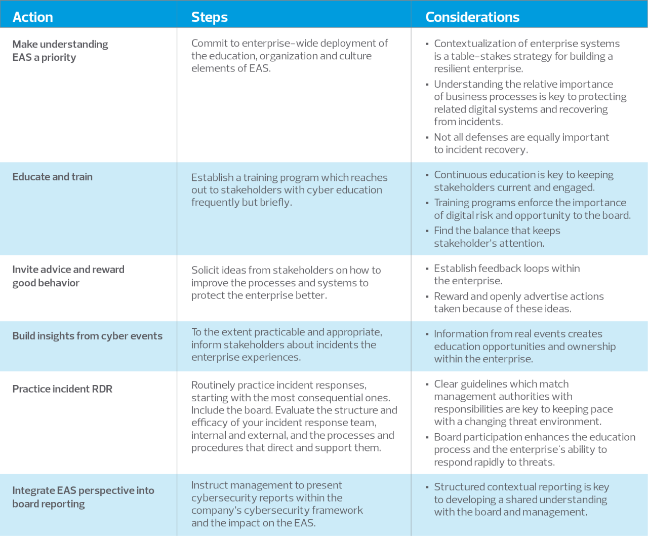 The “educate” and “organize” elements of the EAS set the stage for creating a “culture” of digital risk in which all stakeholders bear responsibility for digital tools and protecting the enterprise against cyberattacks and incidents.
