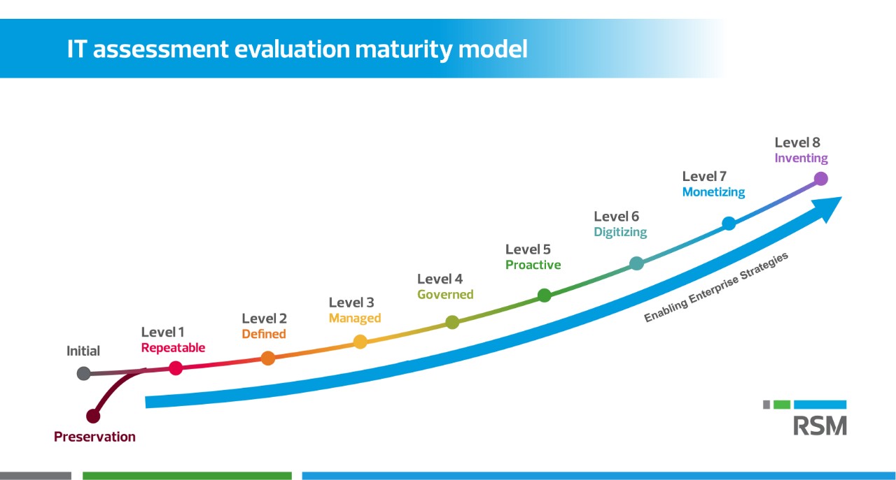 RSM US LLP’s IT assessment provides an overall evaluation of your technologies and supporting IT department. It provides comprehensive recommendations for improvement, suggested solutions based on industry best practices, benchmarking of spending and staffing, and a road map for successful transformation. The IT assessment reviews eight critical areas of your IT operations to help ensure you can have the confidence you need in your technology approach to inspire continued growth.