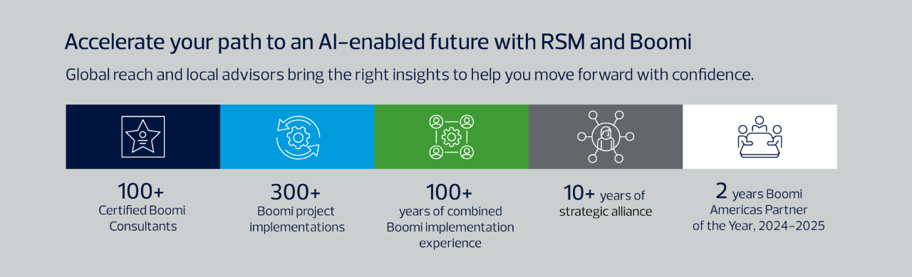 RSM and Boomi bring industry-relevant solutions and expanded productivity to your business. With the integration of agentic AI workflows and AI-powered insights, RSM creates Boomi solutions that are not only efficient but also future-proof, seamlessly adapting to evolving business needs with ease. In addition, RSM has accelerators and pre-built solutions drawn from our extensive experience, streamlining implementation and reducing time to value.